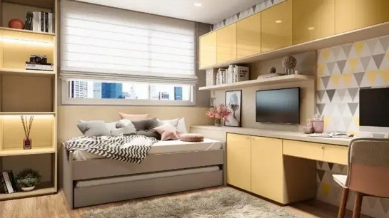 Amarelo: aguça a curiosidade, felicidade, atenção e otimismo. Utilizado no home office ou no dormitório infantil, estimula ainda mais o intelecto e a criatividade.