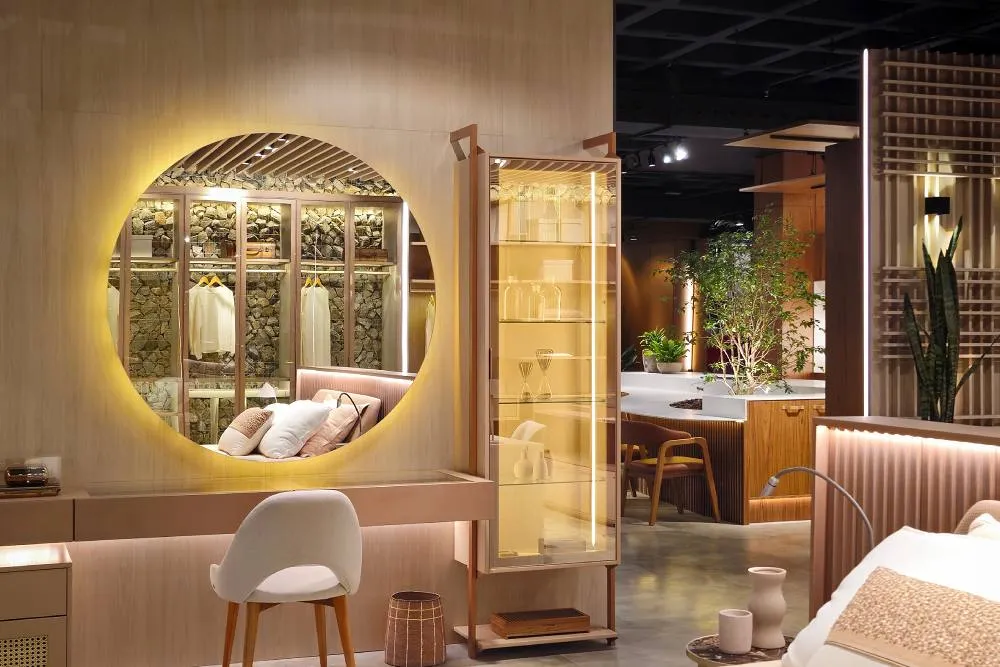 O design de interiores encontra a alta costura na Criare, onde uma vitrine iluminada traz inspiração e celebra a beleza da moda. Este casamento entre vestuário e mobiliário exemplifica como o estilo pessoal pode transcender o dormitório tradicional e trazer um toque de personalidade ao espaço, como este guarda-roupa, que influencia a estética e o seu uso, transformando o ambiente em um reflexo vivo da moda.