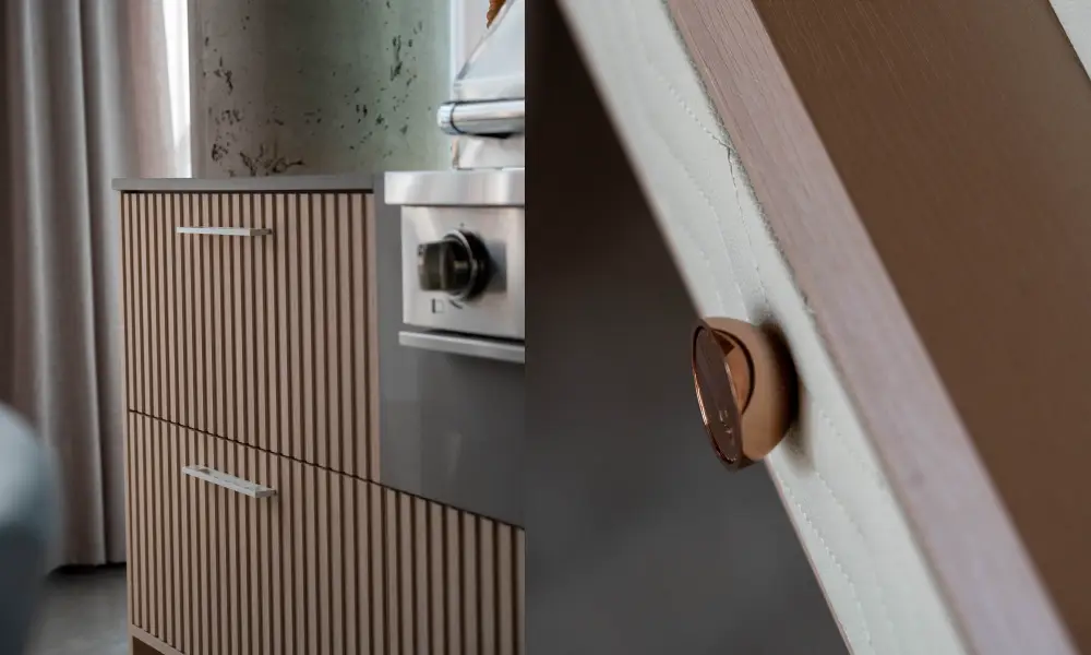 Outro cuidado importante é com o uso cotidiano. Ao abrir portas ou gavetas, prefira segurar o puxador pelo centro para evitar sobrecarga nas ferragens. Também é recomendável evitar o contato direto de anéis, pulseiras ou relógios com a superfície — especialmente em acabamentos metálicos ou laqueados —, já que pequenos atritos podem causar riscos ao longo do tempo. Sempre que possível, faça uma inspeção rápida nas fixações: apertos leves e regulares ajudam a manter estabilidade e prolongar a vida útil das peças.